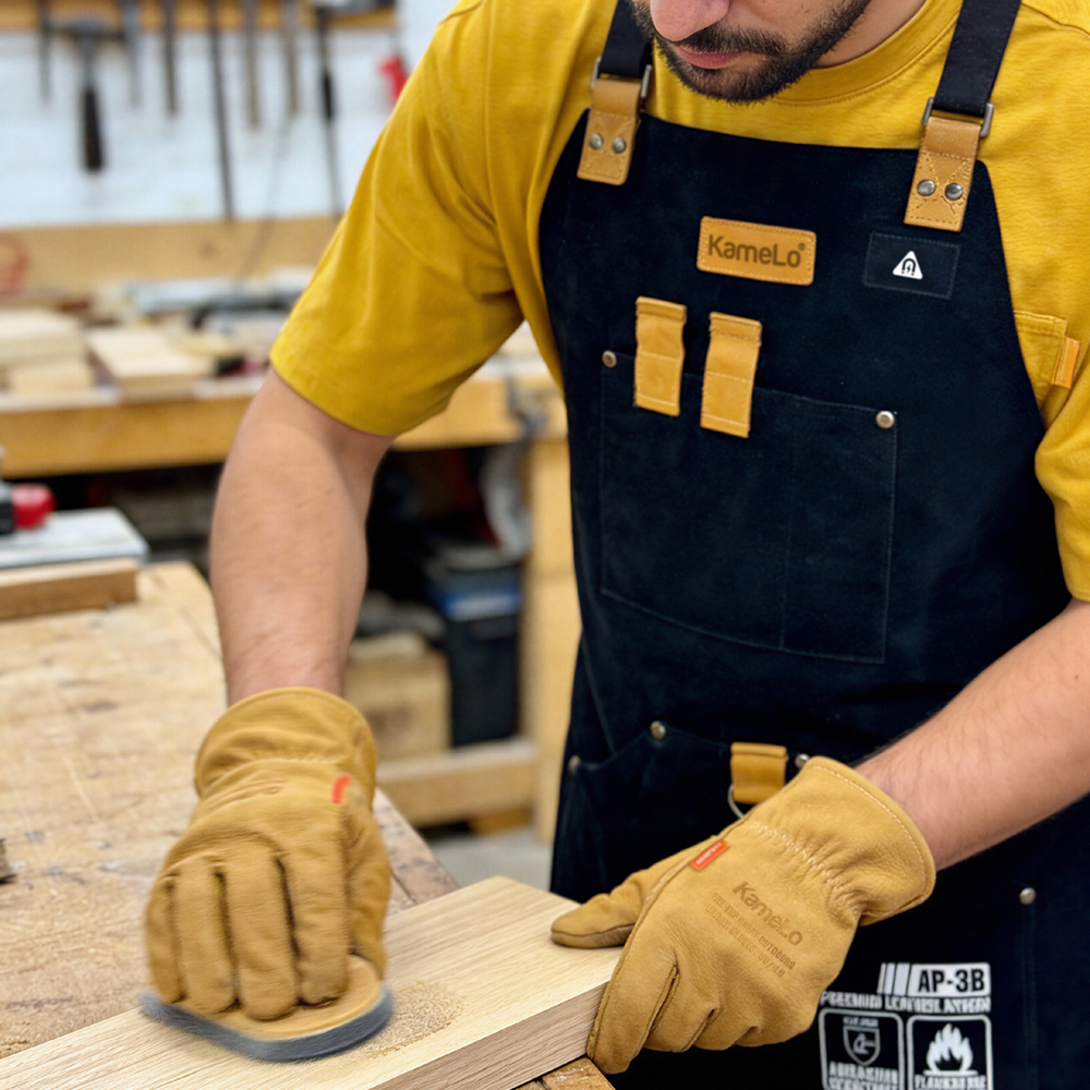 The KameLo AP-3 Leather Welding Apron is a lightweight flame-retardant work apron made from premium suede cowhide leather. Designed for welding, grinding, metal fabrication, blacksmithing, and DIY workshop tasks, it helps protect the body from sparks, heat, and metal debris. With durable leather construction and reliable coverage, it provides comfortable and dependable protection in demanding work environments as well as outdoor activities such as camping or BBQ.