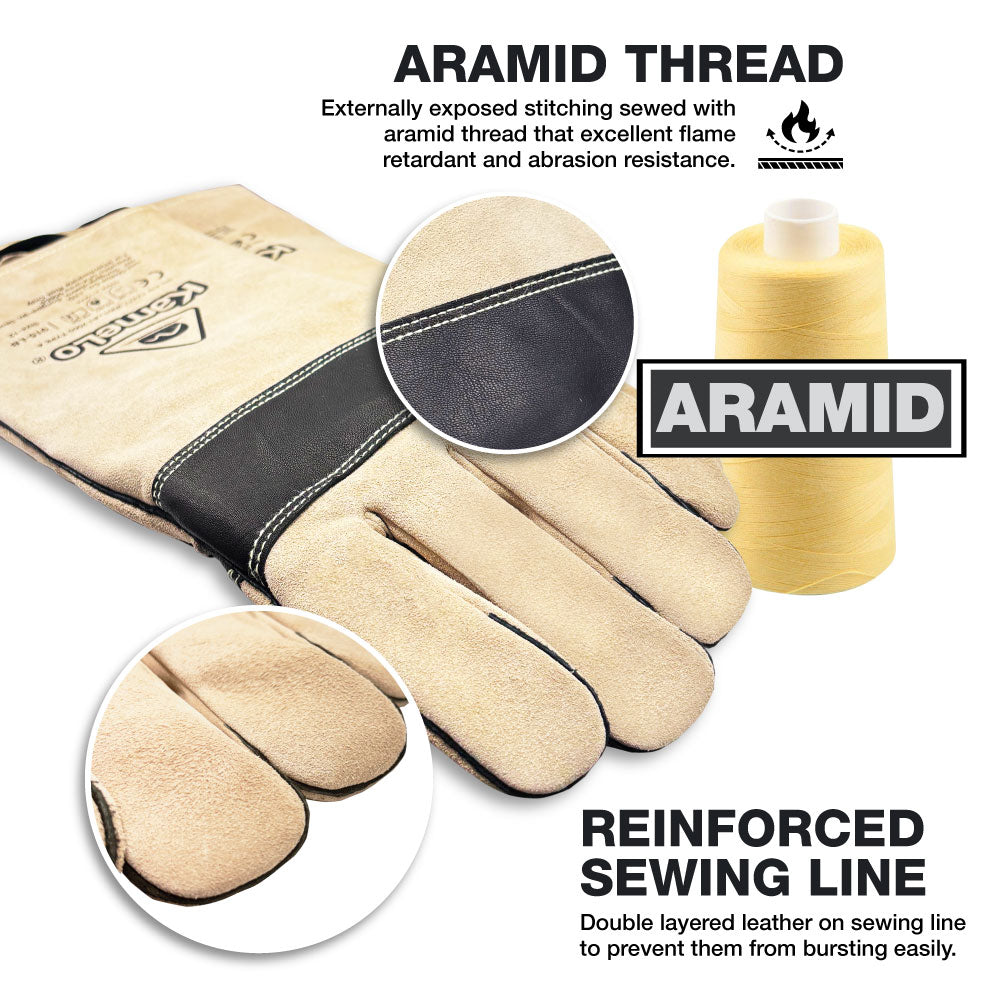 Reinforced palm, knuckle, and wrist with durable goatskin for improved grip and durability - Aramid Thread Stitching for superior flame and abrasion resistance